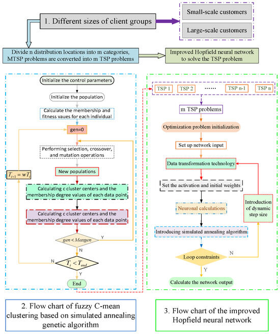 With the development of practice, it is difficult to find polynomial time algorithms for finding optimal solutions for many practical application problems. The use of combinatorial optimization algorithms to solve difficult problems in various fields has become a hot topic; for example, the literature [11,15,16,21,22,24,26,27,28,29], etc. all use hybrid optimization algorithms for the solution, and the results of hybrid optimization algorithms are better than those of the single algorithm solution. In this paper, a combinatorial optimization algorithm is designed to solve the MTSP with multiple unmanned vehicles to complete the order delivery, especially for the scenario where the number of customers in the community increases to hundreds, and the model structure is shown in Figure 2. In the first step, the customers were divided into two types, small scale and large scale, using standard datasets. In the second step, the fuzzy C-means clustering algorithm based on the simulated annealing genetic algorithm was utilized to decompose the MTSP into n-independent TSP. In the third step, data transformation techniques, dynamic step size factor, and the simulated annealing algorithm were introduced to the HNN for solving and obtaining the path solution for each TSP.