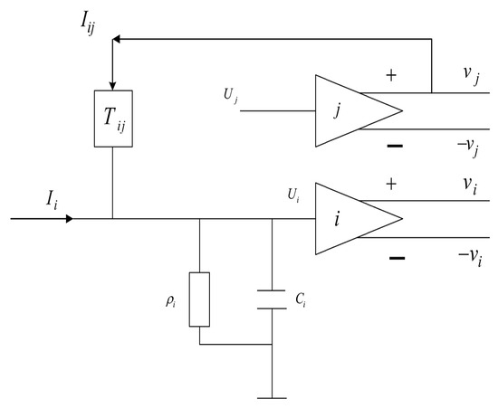 The challenge of path optimization typically involves addressing a nonlinear optimization problem. In this context, the Hopfield neural network, functioning as a nonlinear dynamical system, offers a more adept solution. Its distinctive strength lies in its ability to concurrently manage multiple path optimization tasks, lending it resilience against input data disturbances and noise. Compared to more intricate path planning algorithms, the Hopfield neural network employs simple neuron models and energy functions to delineate the problem. This characteristic streamlines the implementation and application, thus reducing overall complexity [35,36]. The continuous Hopfield neural network (CHNN) is realized through an assembly of straightforward electronic components. Figure 3 illustrates the schematic of a single neuron within the CHNN. This neuron features a feedback connection that spans from input to output, driving a constant state alteration in response to input.