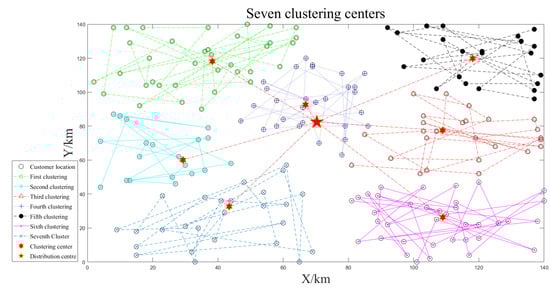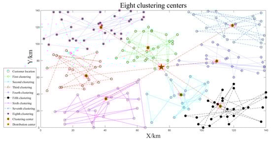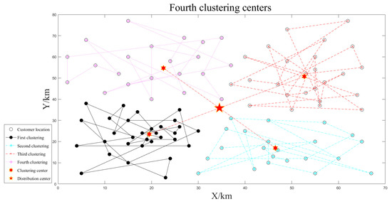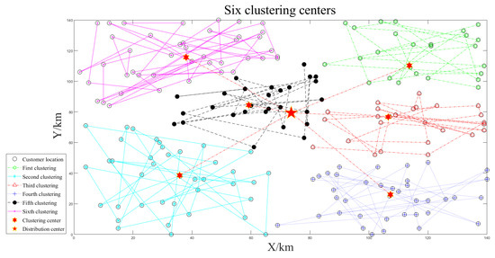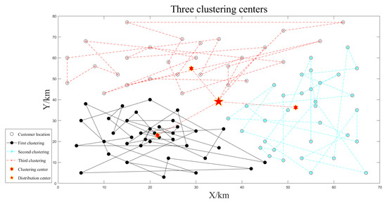 The small-scale customer data is clustered three times according to the number of unmanned vehicles, as shown in Figure 4, Figure 5 and Figure 6. The smaller the optimal target function value , the better the clustering effect.