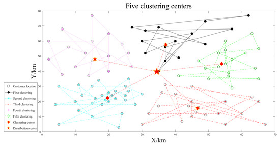 Combined with the model and algorithm above, the programming simulation is carried out in the MATLAB environment. Taking Solomon’s [55] dataset R210 as an example, the corresponding 100 customer locations are extracted, and the coordinate unit is km. Assuming that the distribution center coordinates are (35,35), in the three scenarios, the number of unmanned vehicles is 3, 4, and 5, respectively. The clustering is divided in order, and the speed of unmanned vehicles is 60 km/h. The weight of the material at the service customer point is 2 kg. The latest service time of each customer is within 5 h. The maximum load is 80 kg, and time spent serving customers by unmanned vehicles does not count toward total delivery hours.