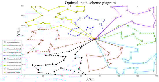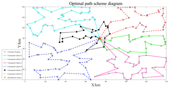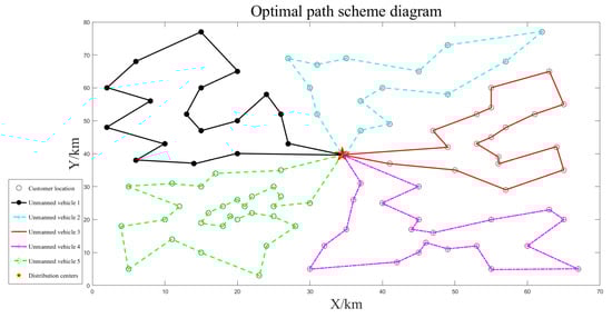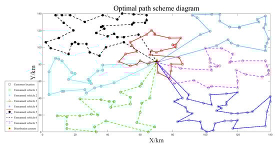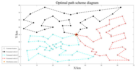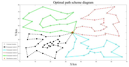 The path optimization results for unmanned vehicles are shown separately in Figure 7, Figure 8 and Figure 9. The unmanned vehicles can complete the delivery task of each customer in turn and finally return to the distribution center, and there is no situation in which the customer is not visited, or the route is intersected during each delivery. The longest driving time was 4.17 h, and the maximum loading capacity was 76 kg, which did not exceed the latest customer service time and maximum loading capacity constraints, and the task assignment was reasonable. The path planning results are shown in Table 3.