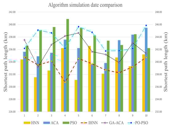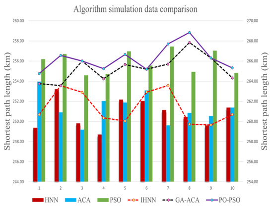 Subsequently, simulations are conducted within the MATLAB environment, and it is observed that, across all six clustering scenarios, the objective function values improve significantly in alignment with the number of unmanned vehicles. Furthermore, multi-unmanned vehicle distributions successfully cover all customer points within the task. Regarding specific simulation results, the IHNN outperforms alternative algorithms, such as SO-PSO, GA-ACA, HNN, ACA, and PSO. In small-scale simulations, IHNN achieves average reductions of 2.71 km, 4.18 km, 6.35 km, 8.83 km, and 10.84 km in the length of the shortest paths compared to the other algorithms. In large-scale simulations, IHNN demonstrates even more significant improvements, saving 3.85 km, 4.85 km, 9.38 km, 9.94 km, and 14.49 km. Notably, the disparity between IHNN and other algorithms becomes more pronounced as the size of the client base increases when addressing the MTSP. Regarding efficiency, IHNN stands out by delivering solutions in a shorter time frame, whereas alternative algorithms require more time and are less efficient. As a result, IHNN significantly enhances both computational efficiency and solution quality, achieving superior global convergence.