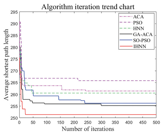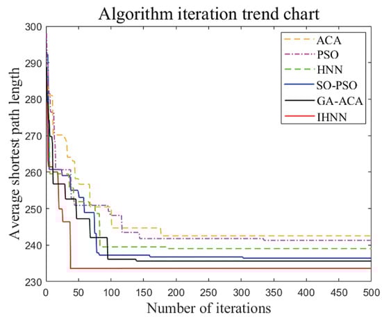 The IHNN consistently achieves smaller values compared to other algorithms across different scales, as is evident in Figure 20 and Figure 21. The results show a stable pattern with minimal fluctuations. In Figure 22 and Figure 23, the iterative convergence of the average shortest path length of each of the six algorithms in small-scale and large-scale instances is given, respectively. In small-scale simulations, the IHNN achieves 233.43, while the GA-ACA achieves 236.14, the SO-PSO achieves 237.61, the HNN achieves 239.78, the PSO achieves 242.26, and the ACA algorithm achieves 244.27. In large-scale simulations, IHNN achieves an average shortest path length of 251.41, while the GA-ACA achieves 255.26, the SO-PSO achieves 256.26, the HNN achieves 260.79, the PSO achieves 261.35, and the ACA achieves 265.90. From the perspective of average shortest path length, IHNN consistently outperforms the other algorithms, although the improvements in the enhanced algorithms SO-PSO and GA-ACA are also significant, with average values within the range of 1–2. In terms of convergence speed, as shown in Figure 23 and Figure 24, the energy function curve of the IHNN demonstrates good convergence behavior. In both small and large-scale simulations, IHNN achieves the lowest energy values of 5.45 and 6.69, respectively, reaching convergence within 50 generations, effectively avoiding the generation of invalid solutions. The enhanced algorithms SO-PSO and GA-ACA also exhibit good performance, as the iteration curves indicate that they do not get trapped in local optima. However, heuristic algorithms such as ACA and PSO do not perform well as they tend to get stuck in local optima and generate invalid solutions. Thus, it is illustrated from several perspectives that the combinatorial optimization algorithm developed using the Hopfield neural network not only converges better but also solves more efficiently with better results.