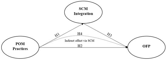 Research by Kannan and Tan [17] underscores the positive correlation between effective POM practices, such as TQM and JIT, and SCM integration. POM practices encompass a gamut of activities, including capacity planning, quality management, and process enhancement, which exert direct influence on production process efficiency and effectiveness [17,41]. These practices are pivotal for achieving operational excellence and elevating supply chain performance. Moreover, certain investigations have revealed that POM practices are instrumental in instituting and upholding effective SCM integration. For instance, Tarn et al. [42] ascertained that organizations adopting advanced production planning and control systems, such as enterprise resource planning (ERP) systems, witness enhanced SCM integration. These systems facilitate real-time data sharing, activity coordination, and informed decision making across the supply chain [43,44]. Furthermore, the research of Flynn et al. [14] suggested that POM practices, such as lean manufacturing and just-in-time production, offer a constructive contribution to SCM integration. Lean manufacturing zeroes in on waste reduction, resource optimization, and production flow enhancement. When amalgamated with SCM integration, lean practices usher in streamlined material flows, reduced lead times, and amplified synergy with suppliers and customers [18,45]. Effective POM practices, including TQM, PCD, and JIT systems, can thus fortify coordination and integration within the supply chain [20]. Consequently, we propose the following hypothesis: