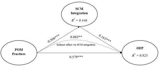 Finally, a mediation analysis was conducted to explore the role of SCM integration as a mediator in the relationship between POM practices and OFP. The researchers applied bootstrapping re-sampling procedures using AMOS 24 [94], following the procedures outlined by Hayes [95]. The analysis involved generating 5000 bootstrapping samples with confidence intervals (CIs) set at the 95% level. The significance of the indirect effect was evaluated through the lower bound (LB) and upper bound (UB) of the bias-corrected CIs. If both limits of the CI do not include zero, it provides support for the alternative hypothesis, thus indicating with 95% confidence that the intervening impact is not equal to zero.