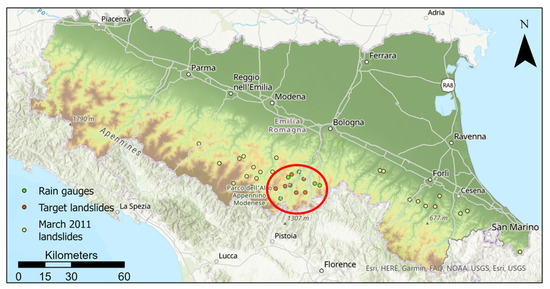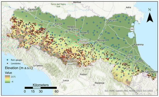 The selected test site is Emilia Romagna region, located in the northern part of Italy (Figure 1). This test site was selected since a large landslide inventory is available. Notably, this inventory has been subjected to prior research activities [6,8,29], which have optimized its quality and relevance. This solid database forms a strong foundation for the current study. In this area, a warning system based on rainfall threshold is available [30], so it can be used for a comparison with the outcomes of this work. A dense rainfall network, with hourly recordings, is available as well.