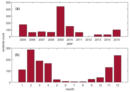 The highest number of landslides was recorded in 2009, while 2012, 2013 and 2014 had fewer landslides with accurate descriptions (Figure 2). Most landslides occurred between November and April, which is the rainiest season in the region, while fewer landslides have been recorded during the summer, when less rainfall is usually recorded.