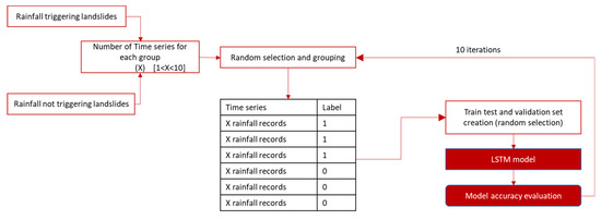The LSTM model underwent ten cycles of train/test/validation for each configuration (the number of rainfall records). In each cycle, the rainfall records were grouped differently (same number of records for each batch, but with different rainfall series), and the accuracy of the model was evaluated in each cycle. This iterative process allowed verifying the stability of model with the given data and configuration, while accuracy values were used to identify the best configuration. The choice of randomly grouping the rainfall records in each batch for each iteration prevented the overweighting of the areas with more landslide (this would happen if rainfall records were grouped on the basis of the spatial location), hence avoiding the biasing or overfitting of the model (changing the data in each batch every time avoided that the model was over-adapted to specific groups of time series). This approach was consistently applied across all selected time intervals to maintain the integrity and robustness of the model throughout the research.
