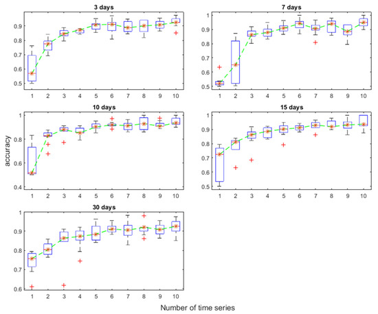 Figure 4. Boxplots showing the evaluation of the efficiency of each model configuration. Each panel represents the result for a different time interval using from 1 to 10 time series. Asterisks represent the median value of accuracy of each configuration, red crosses represent the outliers.