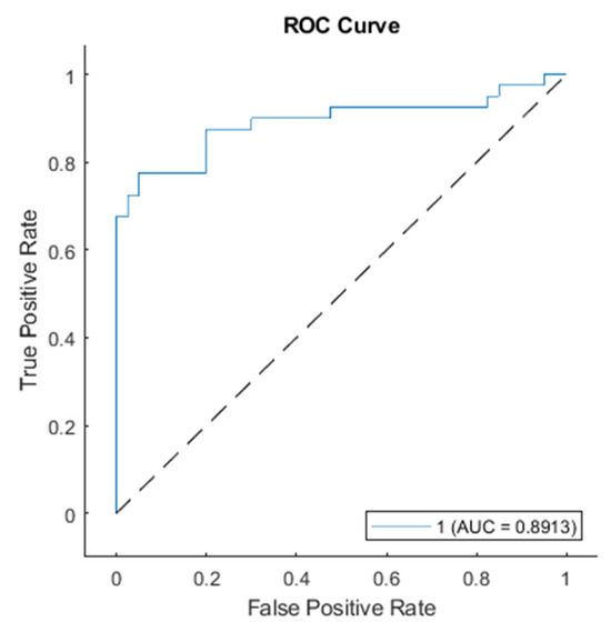 The ROC curve showed an area under the ROC curve (AUC) value of 0.9 (Figure 5), indicating a satisfactory performance of the model. Such a high value can indicate the presence of an overfitting issue, but this evidence can be discarded, since several precautions were taken to avoid this problem, as described in the previous section.