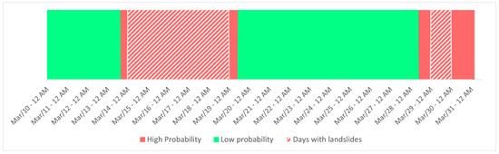 Figure 7. Schematic representing the temporal distribution of landslide probabilities over the validation period. Green represents the periods in which the model predicted low landslide probability, red indicates periods with prediction of high landslide probability, and white stripes indicate the days with landslides.
