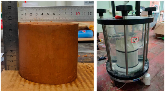 For the purposes of this experimental work, five types of modified RC samples were designed with FA contents of 0% (pure RC), 2%, 4%, 6%, and 8%. RC samples were passed through a 5 mm sieve and mixed with FA in the specified proportion, after which the test samples were compacted at optimum moisture content and 95% of their maximum dry weight. The permeability test was conducted using a flexible wall infiltrometer. Sample preparation and test setup are shown in Figure 1.