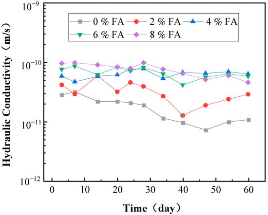 The value of the permeability coefficient of the RC anti-seepage layer is an important indicator of the anti-seepage performance of the clay liner, which will change under the long-term corrosion of RM leachate [29]. The variation in the value of the permeability coefficients of the different FA-modified RC corroded by RM leachate is shown in Figure 2. In the early stage of the permeability test, the value of the permeability coefficient of the compacted modified RC increased with increasing FA content, while at the later stage of the test, it varied with FA content. In particular, the permeability coefficient for the 8% FA-modified RC stabilized at 5.98 × 10−11 m/s, which is smaller than the corresponding values for the 4% or 6% FA-modified RC, showing a relatively downward trend. It indicates that the 8% FA-modified RC is significantly affected by permeability, but its anti-seepage ability is enhanced. However, pure RC with a 0% FA content showed the smallest permeability coefficient, with a value of 9.87 × 10−12 m/s.