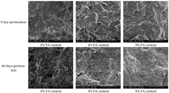 To compare the microscopic pore structure changes of the modified RC anti-seepage layer after RM leachate permeation, representative pure clay, 4%, and 8% FA-modified RC samples were examined using SEM before and after 60 days of permeation. The SEM images at a 10 scale are shown in Figure 4. As can be seen, the compacted modified RC particles were transformed from large lumps before permeation into many small particles, with their overall state changing from smooth and compact to rough and loose. Further, various small pores were generated in the modified RC after permeation. Compared to pure clay, the small clay particles of the FA-modified RC were significantly reduced, which was consistent with results reported by Zhao et al. [25].