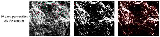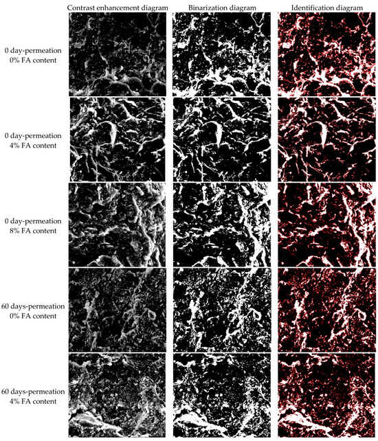 To facilitate the identification of particles and perform numerical statistical analyses, the contrast enhancement diagram, binarization diagram, and identification diagram of compacted FA-modified RC before and after 60 days’ permeation under RM leachate are shown in Figure 5.