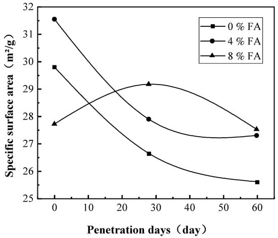 As the permeation time increased, the specific surface area of the 8% FA-modified RC first increased and then decreased, increasing from 27.71 m2/g before permeation to 29.17 m2/g and then decreasing to 27.52 m2/g after 60 days. All other samples showed a decreasing trend in specific surface area. The 4% FA-modified RC decreased from 31.55 m²/g to 27.52 after 60 days of penetration. RM leachate is a highly alkaline and highly concentrated industrial wastewater with a large number of free alkaline anions, which can corrode soil structure and reduce soil strength, resulting in a decrease in soil specific surface area [41,42]. Therefore, the modified RCs all showed varying degrees of reduction in specific surface area with increasing days of permeation. As there was a large amount of FA that did not completely react in the 8% FA-modified RC, it reacted more completely in the alkaline and humid environment. The increase in specific surface area through the production of gelling substances can overcome the reduction in specific surface area caused by RM leachate-induced corrosion, resulting in an increase in specific surface area in the 8% FA-modified RC in the medium-term. However, as time increased, the corrosion caused by RM leachate to the structure became more severe, such that the specific surface area eventually decreased [43].