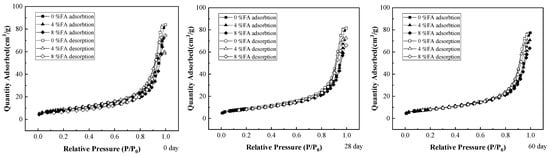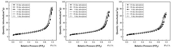 The adsorption curves of different FA-modified RCs are shown together in Figure 7. At 60 days of penetration, the adsorption capacity of the sample with a 0% FA addition was 77.62 cm3/g, while the sample with a 4% FA addition was 71.35 cm3/g. The adsorption capacity of the sample with an 8% FA addition was the lowest, which was at 64.78 cm3/g. As the FA content increased, the adsorption of the modified RC gradually decreased, presumably owing to the many glass microbeads with a smooth surface contained in the FA. Although some of these beads can gelatinize with the clay to form a stable structure, much of the FA is not involved in such interaction, as these glass beads reduce the adsorption capacity of the modified RC [44,45].