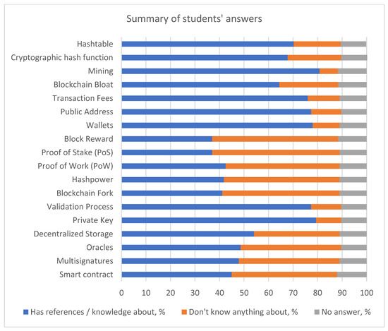 The second section opened with the year in which respondents heard of the concept and the context in which they heard about it. Also, this section included 18 terms, named variables, which illustrated concepts and whether the respondent knew about them before. The concepts are Smart Contracts, Multi-Signatures, Oracles, Decentralized Storage, Private Key, Validation Process, Blockchain Fork, Hashpower, Proof of Work, Proof of Stake, Block Reward, Wallets, Public Address, Transaction Fees, Blockchain Bloat, Mining, Cryptographic hash function, and Hashtable. The first research question was formulated in connection with the findings from the literature review and was expressed as follows: H1. Did the utilization of blockchain technologies in the education sector influence the demand for blockchain knowledge in various domains?