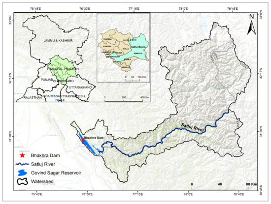 The Sutlej basin area considered for the study is about 21,595 km2 and located between 75°39′5.06″ and 79°38′51.45″ E longitude and 30°50′56.22″ and 32°59′56.94″ N latitude, having an elevation range of 359 m to 6750 m above MSL (mean sea level) (Figure 1). The Sutlej River is perennial in nature because a large area of the catchment contributes to snowmelt, and it is estimated that more than 50% of the runoff in the Sutlej River is from snowmelt. The Sutlej River travels about 322 km inside the Tibetan Domain and then enters India near Shipkilla (Tashigang village). The Sutlej River then travels about 300 km up to Bhakra Dam. Many major canals stretch out from the Sutlej River, indicating the river’s importance as a waterway for agriculture and power generation. The Beas and Chenab rivers, the two largest tributaries, enter from the right. The Dipalpur, Pakpattan, Panjnad, Sirhind, and Bikaner canals are all major irrigation systems that originate from the Sutlej. The area has varying climatic and topographic conditions and is widely used for irrigation and hydropower production The large Bhakra Nangal Dam has been constructed in India at the point where the river emerges from the mountains. The Bhakra Beas Management Board (BBMB), created by the Government of India in 1966, is responsible for its management and distribution.