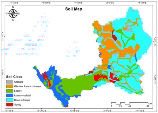 It is relevant to know the soil type, as it is useful for estimating erodibility. The Sutlej River catchment has nearly poor sandy loam soil, constituting uncropped substratum, and stony soil. The soil in the study area has been grouped as Udalts—Ochrepts (shallow and brown in color), Othents—Ochrepts (shallow, red, loamy, and sandy, which is suitable for horticulture), Udoll soil (cold desert), and glaciers and snow cap soils. Medium deep, well-drained soil with loamy surface has been observed in the lower reach of the Sutlej with a limited area (Figure 2). Using Figure 2, the availability of soil types in the catchment can be seen—glaciers, sandy, loamy skeletal, glaciers and rock outcrops, loamy, and rock outcrops—according to their coverage and weightage. Table 1 shows the spatial variation of soil types and erodibility factors in that order.
