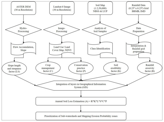where A is the loss of soil rate per unit area, stated in the units selected for K and for the period selected for R. A is expressed in (tons/ha/year), but other units can be selected (i.e., ton/km2/year); R defines the rainfall-runoff erosivity factor for a specific field plus a factor for any significant runoff from snowmelt (MJ-mm-ha−1 h−1 year−1); K represents the erodibility factor—the soil loss rate per unit area of specified soil as measured on a standard plot, which is defined as a 22.1 m length of a uniform 9% slope in continuous clean-tilled fallow, expressed in (t-h-ha/ha/MJ/mm); L and S are dimensionless topographic factors that represent the slope length and steepness of a catchment, respectively; C is the crop management factor (dimensionless) for a specific field; and P is the dimensionless protection practice factor, which accounts for soil loss as a ratio of a particular practice, such as contouring or strip cropping, to the corresponding soil loss up and down the slope [21]. Various steps involved in the methodology are summarized in Figure 4.