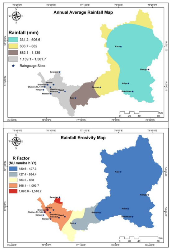 where R is the erosivity factor (MJ-mm-ha−1 h−1 year−1), Pi is the monthly rainfall (mm), and P is the annual rainfall (mm). The average values of erosivity ranged from 180.6 to 1518.7 MJ-mm-ha−1 h−1 year−1. Figure 5 represents the erosivity map developed using precipitation data for the Sutlej catchment.