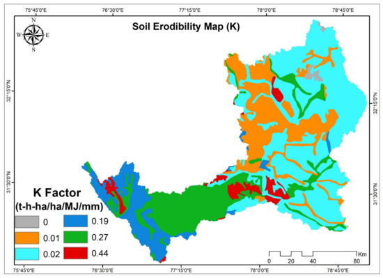 Erodibility (K) can be defined as a proportion of vulnerability of soil elements to damage per unit of erosivity for an identified soil on a unit plot having a 9% uniform slope and a slope length of 22.13 m over a persistently orderly abandoned land with an all over inclination surface. K naturally ranges from about 0.10 to 0.45, with high-sand and high-clay content soils having lower standards and high-silt content soils having higher standards [22,27]. In RUSLE, erodibility is supposed to be determined consistently.