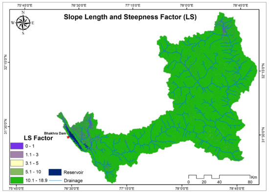 where λ is the field slope length (m), 22.13 is the RUSLE unit plot length (m), and m is a variable slope-length exponent, which is dimensionless in nature and which depends on the slope steepness, being 0.5 for slopes exceeding 5%, 0.4 for 4% slopes, and 0.3 for slopes less than 3%. The topographic factor (LS) map and its spatial distribution for the Sutlej catchment using ASTER DEM are shown in Figure 7, while a 30 m gird was used as the field slope length (λ). The assumption for slope length was the same for many researchers [2,3,33,44,46,47]. The field slope length (λ) is characterized as the horizontal separation from the beginning of runoff to the point, where either (1) the slant angle diminishes enough that deposition starts, or (2) overflow ends up amassed in a characterized channel. Thus, soil loss varies as the field slope length varies.