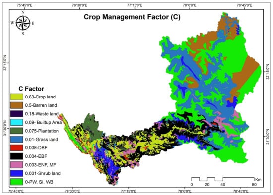The crop factor is the utmost essential constraint utilized in both USLE and RUSLE that demonstrates the impacts of vegetation and other land crops on the soil loss assessment [17,18]. The C factor can be defined as a fraction of the soil loss rate from a region with specified crop and management to that of an indistinguishable area [20]. In this study, LULC was prepared for the ISRO Geosphere Biosphere Program under the project entitled “Land Use/Land Crop Dynamics and Impact of Human Dimension in Indian River Basins” for the year 1995 on a scale of 1:2, 50,000 was used to derive the layers of various LULC parameters. The Sutlej basin has been classified into fourteen land use classes, namely, barren land, built-up land, crop land, deciduous broad leaf forest, evergreen broad leaf forest, evergreen needle leaf forest, grassland, mixed forest, permanent wetland, plantation, shrub land, snow and ice, waste land, and water bodies. Land use/land crop and their C factor values are shown in Figure 8, and statistics of each land use/land crop and their C and P factor values are presented in Table 4. The C values were used in the present study in concurrence with [30].