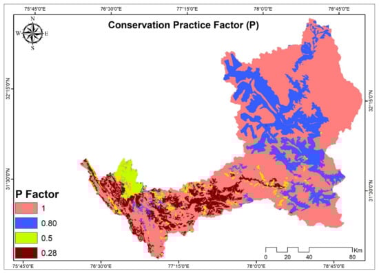 Practice factor (P) for RUSLE shows the surface condition that affects the flow pathways and flows hydraulics [22] and also reflects the erosion control estimates, for example, terracing and strip cropping. Estimation of practice factor, P, unlike management training, is given by [2,8]. Standard of P factor values range from 0.28 to 1, as shown in Figure 9, and assigned standards for each class are revealed in Table 3 for the Sutlej catchment, in which a higher value of P factor shows the minimum conservation practices, and a lower value of P factor shows good conservation practices.