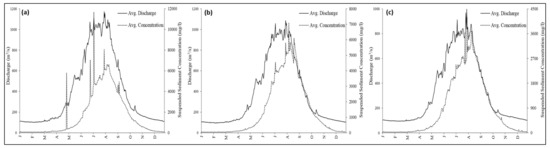 Average discharge and suspended sediment regimes in the Sutlej River at Kasol (a), Suni (b) FY (1995–2005), and Rampur (c) FY (1995–2003).