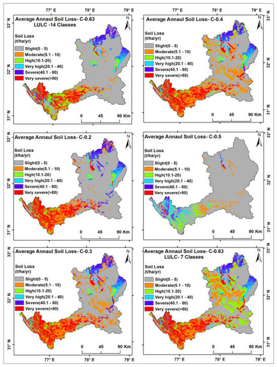 In order to characterize the crop management values (C), the Sutlej catchment was classified into seven as well as 14 land Use/land Crop classes using ISRO-GBP data. The crop management value for the northern Himalayan region varied from 0 to 0.63. The closer agreement between observed and simulated average annual soil loss was obtained using C as 0.63 and 14 land use classes. The erosion map, as shown in Figure 11, was created using varying C values from 0.2 to 0.63 and seven and 14 LULC classes. It can be seen from the figure that the erosion computation was highly sensitive to the number of LULC classes and adequate choice of C. Therefore, it is essential that calibration must be exercised to identify the appropriate number of classes along with the optimum C.