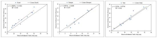 Observed and simulated sediment yield at Kasol, Rampur, and Suni.