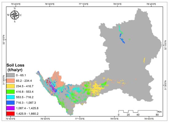 After verifying Horton’s laws for stream area, stream length, and stream numbers, nine sub-watersheds created in the entire Sutlej catchment and the erosion-affected areas were generated by the weighted index method in GIS using the spatial analyst tool and prioritization of sub-catchments defined into six classes, which was recommended by [2,8] for Indian conditions, as follows: slight, moderate, high, very high, severe, and very severe, in units of t ha−1 year−1. It was observed that about 62.91% of the area of the catchment was falling below the minor erosion class (Table 8). The regions exposed to moderate, high, very high, serious, and very serious erosion impending classes were 7.42%, 7.75%, 5.36%, 5.14%, and 11.42% of the whole topographical area, respectively.