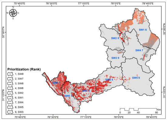 Thus, from a degradation point of view, the final four categories of soil erosion in the river basin need immediate attention. According to the average yearly soil loss from the sub-catchments, the SW9, SW7, SW8, SW6, SW2, SW1, SW4, SW2, and SW3 should be prioritized in that order. Primacy levels indicate how we should care for the watershed area with plants and conservation efforts. Table 9 and Figure 16 offer a prioritization of Sutlej catchment sub-watersheds. The current literature also includes references to physics-based research [1] that makes use of sediment transport and deposition. This article does not fully explore the possibilities of such methods; future work will determine whether physics-based models provide any advantages over the more standard RUSLE approach.