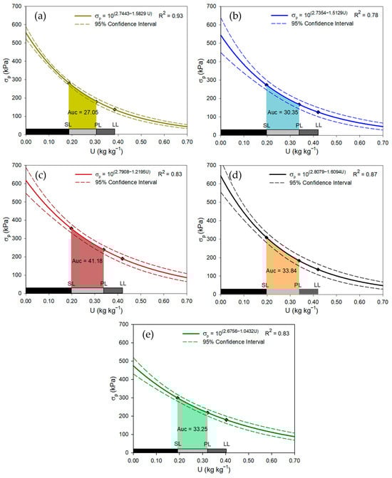 Load-bearing capacity models (σp = 10(a+bU)) of an Oxisol after the application of the statistical procedure by []. (a) Burned harvest sugarcane at the 0.00–0.30 m layer; (b–d) mechanized harvest sugarcane at 0.00–0.10-, 0.10–0.20-, and 0.20–0.30 m layers, respectively; (e) native forest at 0.00–0.30 m layer. Points within each chart correspond to the σp for the respective soil consistency limits: SL = shrinkage limit, PL = plastic limit, LL = liquid limit. Auc: area under the load-bearing capacity curve in the soil friability region.