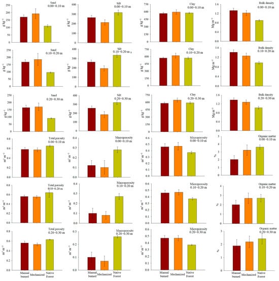 The particle size distribution of soil in the sugarcane areas, when compared to the native forest area, showed a relative difference in sand content, ranging between 75% and 94% in the mechanized harvest area, and between 55% and 80% in the burned harvest area. Conversely, the relative differences in silt content ranged from −33% to −43%, and −5% to −7% for the mechanized and burned harvest areas, respectively (Figure 3). For the clay content, the relative differences did not exceed 10% in both sugarcane areas when compared to the native forest, despite indicating soils of a distinct textural class. The higher sand content in both these areas with anthropic uses may have also influenced the greater load-bearing capacity of the soil when compared to the native forest area. Findings by [] demonstrated that the sandier Oxisols exhibited an increased load-bearing capacity under specific soil water tension.