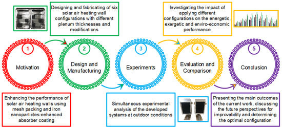 This research aims to improve the performance of solar air heating walls (SWs) using iron meshes and an iron nano-enhanced absorber coating. In this regard, two SW boxes have been manufactured with varying plenum thicknesses. In the first test, unglazed SWs with two plenum thicknesses have been examined. In the second test, the SWs have been modified with mesh packing material. In the third experiment, the effect of simultaneous utilization of mesh packing and nano-coating on the performance has been analyzed. Different from other works, the combined usage of mesh packing and a nano-enhanced absorber coating has been tested in unglazed SWs for the first time. The major steps of the present work are shown in Figure 1.