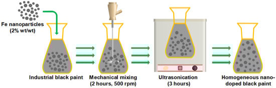 In this work, we aim to improve the performance of unglazed SWs using mesh packing and nano-doped black paint. In this context, two types of absorber coating materials have been utilized in the systems. The first coating material is conventional matt black paint. Iron (Fe) nanoparticles were mixed with matt black paint in the second coating material for enhanced thermal conductivity. Fe nanoparticles with 2% w/w concentration have been used to improve the performance of SWs. The mixture has been mechanically mixed and sonicated to attain a homogeneous nano-doped coating. The preparation steps of the nano-doped coating are presented in Figure 2 as a schematic illustration. It should be indicated that the average thermal conductivity was improved 7.13% (from 0.6392 to 0.6848 W/m·K) by adding Fe nanoparticles. It should be noted that the particle concentration value and preparation techniques were applied considering previous scientific studies [42,46,47,49,50].