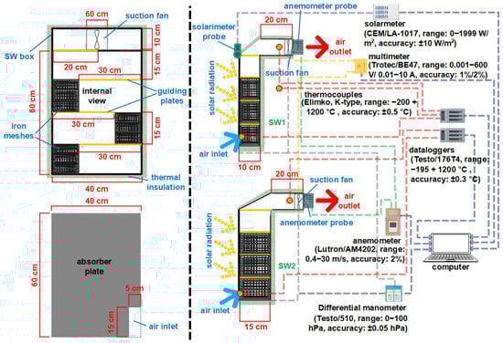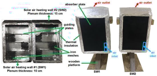 In this work, two SW cases with 10 cm and 15 cm plenum thicknesses were developed and manufactured to evaluate the impact of plenum depth on the thermal and enviro-economic performance. The SW cases were manufactured using a 0.1 cm thick aluminum sheet. Axial suction fans with 40 W power were placed to each system. The SWs with 10 cm and 15 cm plenums were named SW1 and SW2, respectively. Also, guiding plates were placed on the air channels of the SWs to increase the residence time of air. Aluminum sheets with 0.1 cm thickness were used as absorber surface. In the first test (Exp. 1), developed SWs were tested, and this experiment has been used as a control group for a comparison of examining the impacts of the modifications in the further experiments (Exp. 2 and Exp. 3). In Exp. 2, iron meshes have been used to upgrade the heat transfer and turbulence intensity. Previously, the effectiveness of iron meshes in different solar–thermal systems has been numerically and experimentally analyzed [36,37]. Iron meshes are cost-effective extended heat transfer surfaces and can be used in various solar energy systems. However, iron meshes may have some disadvantages such as the possibility of corrosion in long-term use. Since the iron meshes are quite low cost and available in the worldwide market, they can be replaced easily for maintaining the SWs. It should be noted that 12 iron meshes have been used in each system. Iron mesh-integrated SWs with 10 cm and 15 cm plenum thicknesses were named as SW1/MP and SW2/MP, respectively. In Exp. 3, the developed nano-doped black paint was applied to the absorber surfaces of the mesh-integrated systems. The aim of Exp. 3 is to evaluate the impact of combined employment of mesh packing and nano-doped paint on the performance of SWs. SWs containing mesh packing and nano-paint with 10 cm and 15 cm plenums were named SW1/MP-NP and SW2/MP-NP, respectively. It should be indicated that SWs with 10 cm and 15 cm plenums have been tested simultaneously at the same environmental conditions. A schematic view and photographs of the experimental setup are presented in Figure 3 and Figure 4, respectively. The analyzed SWs in this study have been designed according to the previous studies of our research group [22,45]. In previous studies, the applicability of SWs with various modifications has been analyzed. Different from previous studies, in the current work, the influences of using two modifications on the thermal performance of unglazed SWs have been experimentally analyzed. The geometrical parameters have no significant impact on performance improvement of the nano-coating. However, as stated, adding mesh modification in different systems may have various effects. Therefore, it is necessary to investigate the effect of using iron mesh modification in different systems.