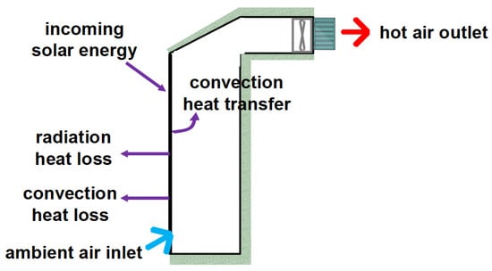 Heat transfer mechanisms in the SW are illustrated in Figure 5. The general perspective of heat transfer in the SW is shown in the figure. Incoming solar rays are absorbed by the metal plate of the system. The working fluid is heated up in the plenum of the SW by convection heat transfer from the absorber surface. In other words, a large portion of the heat transfer to the air occurs by convection heat transfer. Also, a part of the gained energy by the absorber surface is lost to the environment by radiation and convection. By adding guiding plates and iron meshes, the heat transfer surface area increases, and heat transfer to the air by convection improves. There are some systems available in the literature that integrated extended heat transfer surfaces to SWs. In the present work, iron meshes with guiding plates were integrated to SWs different from previous studies for enhancing the thermal performance.