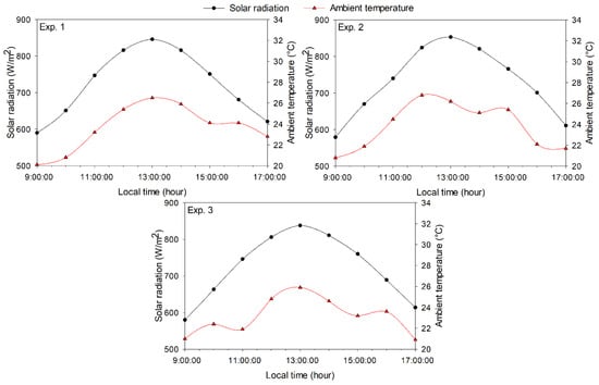 As mentioned in the previous sections, three different SW configurations for two plenum thicknesses were examined in this empirical study. Figure 6 shows time-dependent variations in environmental conditions among the performance tests. Solar radiation values in Exp. 1, 2 and 3 were in the ranges of 590–846 W/m2, 579–853 W/m2 and 580–838 W/m2, respectively. Average solar radiation values were obtained in Exp. 1, 2 and 3 as 724 W/m2, 729 W/m2 and 723 W/m2, respectively. It must be noted that the solar radiation values were measured from the vertical face for reliable performance calculations. Moreover, the average ambient temperature values in Exp. 1, 2 and 3 were 23.66 °C, 23.83 °C and 23.14 °C, respectively. As can be seen, the mean ambient temperature and solar radiation values are very close to each other, which facilitates a reliable comparison between the proposed system configurations.