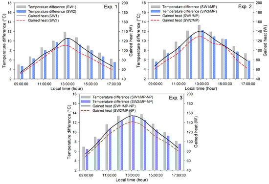 Figure 7 presents time-dependent changes in temperature differences in air and gained useful thermal energy. In Exp. 1, the average gained heat for SW1 (unmodified system, plenum thickness: 10 cm) and SW2 (unmodified system, plenum thickness: 15 cm) was 89.25 W and 80.99 W, respectively. Also, the mean temperature differences between the outlet and inlet air for SW1 and SW2 were found to be 8.40 °C and 7.62 °C, respectively. In Exp. 2, the average useful heat values for mesh packed systems including SW1/MP and SW2/MP were 103.72 W and 94.0 W, respectively. Moreover, the average temperature difference values for SW1/MP and SW2/MP were 9.77 °C and 8.90 °C, respectively. As it can be seen, placing iron meshes in the system improved the average gained heat by 16.21% and 16.06%, respectively, for plenum thicknesses of 10 and 15 cm. In Exp. 3, the effect of the simultaneous application of mesh packing and nano-doped paint on the performance has been analyzed for two plenum thicknesses. In this experiment, the average gained heat for SW1/MP-NP and SW2/MP-NP was 117.14 W and 107.8 W, respectively. Additionally, the obtained mean temperature differences for SW1/MP-NP and SW2/MP-NP are 11.00 °C and 10.1 °C, respectively. As can be seen, the simultaneous application of mesh packing and nano-doped absorber coating improved the average gained heat for the SWs with 10 cm and 15 cm plenum thicknesses as 31.24% and 33.10%, respectively, compared to the base (conventional) cases.