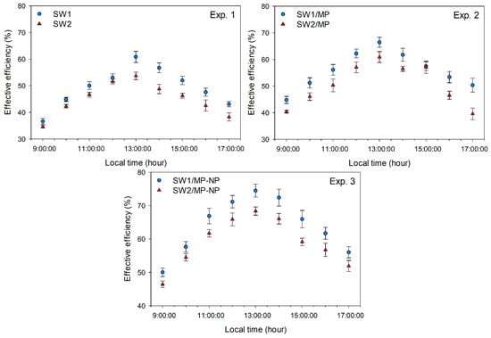 Figure 8 shows time-dependent alterations in effective efficiency values. Effective efficiency considers the pressure drop in the system, which is the biggest difference between thermal (energy) efficiency. In Exp. 1, the instantaneous effective efficiency values for SW1 and SW2 ranged between 36.66 and 60.85%, respectively. The obtained average effective efficiencies for SW1 and SW2 in Exp. 1 were 49.25 and 44.93%, respectively. The effective efficiencies for SW1/MP and SW2/MP in Exp. 2 were found between the ranges of 44.78–66.42% and 39.55–60.88%, respectively. The mean effective efficiencies in SW1/MP and SW2/MP were 55.96% and 50.46%, respectively. In Exp. 3, the effective efficiencies were achieved for SW1/MP-NP and SW2/MP-NP in the ranges of 50.03–74.48% and 46.42–68.35%, respectively. The average values of effective efficiency for SW1/MP-NP and SW2/MP-NP were calculated as 64.02% and 58.95%, respectively. Similarly, Singh et al. [32] used wire meshes in a double-flow SAHS, and the stated modification significantly improved the effective efficiency value.