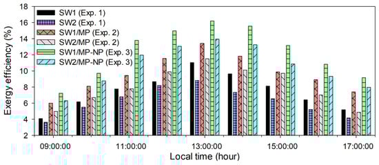 The time-dependent alterations in exergetic efficiencies are represented in Figure 9. The highest instantaneous exergy yield value was obtained as 16.20% in SW1/MP-NP in Exp. 3. The average exergy efficiencies for SW1, SW1/MP and SW1/MP-NP were attained as 7.45%, 9.61% and 12.29%, respectively. The mean exergetic efficiency values for SW2, SW2/MP and SW/MP-NP were found to be 6.24%, 8.10% and 10.60%, respectively. It can be seen that reducing plenum thickness and applying two modifications combined improved the average exergy efficiency almost twice. There are some similar results obtained in the literature with the present work. In a research, a solar air heating system with an energy storage component has been analyzed, and the exergetic efficiency was found to be in the range of 5–20% [67]. Fudholi et al. [68] examined a grooved air heater and found this metric in the range of 12.89–13.36%. In another work, conical extended heat transfer surfaces were integrated into a solar air heating device, and the exergy yield was 9–19% [69].