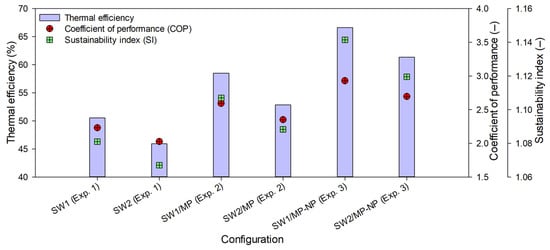 Figure 10 presents a comparison of some performance indicators including thermal efficiency, COP, and SI values for the tested SW configurations. The average thermal efficiency values for SW1, SW1/MP and SW1/MP-NP were 50.55%, 58.50% and 66.62%, respectively. The mean thermal efficiencies for systems with 15 cm plenum thickness including SW2, SW2/MP and SW2/MP-NP were 45.92%, 52.90% and 61.30%, respectively. It can be said that reducing the plenum thickness (from 15 to 10 cm) and combined utilization of mech packing and Fe nano-doped absorber coating improved the mean thermal efficiency by 45.07% (SW2 vs. SW1/MP-NP). There are some works on solar air heating systems that found thermal efficiency values in the range of 14.40–66.16% [70,71,72]. Additionally, similar performance enhancement findings were obtained using packing materials in some research. In a study, Prasad et al. [73] applied wire screens as a packing material to an SAHS and significantly improved their thermal efficiency values. In a different research study, iron meshes were integrated to a double-flow system, and this modification improved the thermal efficiency from 70.60–72.15% to 78.06–80.39% [37].