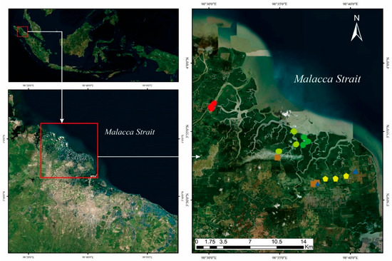 Study sites of six land uses in Karang Gading and Langkat Timur Laut Wildlife Reserve, North Sumatra, Indonesia. Red dot denotes mixed agriculture dry land, dark green shows natural mangrove forest, light green depicts mangrove restoration, brown indicates pond, yellow shows oil palm, and blue represents paddy field.