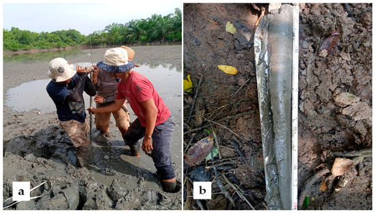 (a) Soil sampling was collected in pond (b) using Russian peat auger.