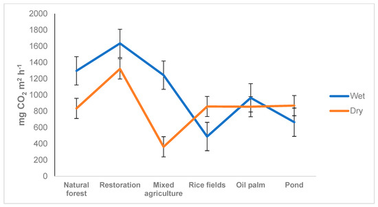 The average flux of CO2 in mangrove natural forest land cover was found to be 1297 mg CO2 m2 h−1 during the rainy season and 835 mg CO2 m2 h−1 during the dry season (Figure 4). CO2 flux in restored land cover during the rainy season was found to be an average of 1635 mg CO2 m2 h−1, while in the dry season, it was 1321 mg CO2 m−2 h−1.