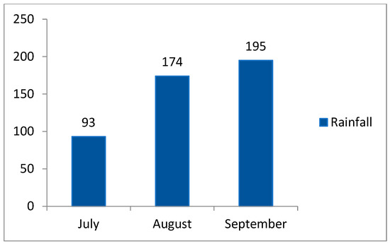 Table 5 indicates that the t-tests show that there was no difference in the average amount of CO2 flux between the dry and rainy seasons in primary forests (Table 5). Similarly, there was no difference in the average amount of CO2 flux between the dry and rainy seasons in restoration forests, mixed agriculture, rain ponds, and oil palm plantations. However, there was a difference in the average CO2 flux between the dry season and the rainy season in rice fields (0.03 < 0.05). During the study period, the rainfall varied between the dry season (July–August) and the rainy season (September), as shown in Figure 5.